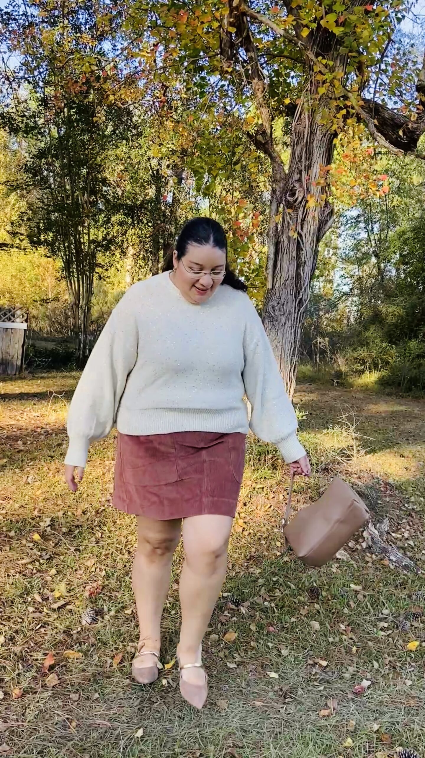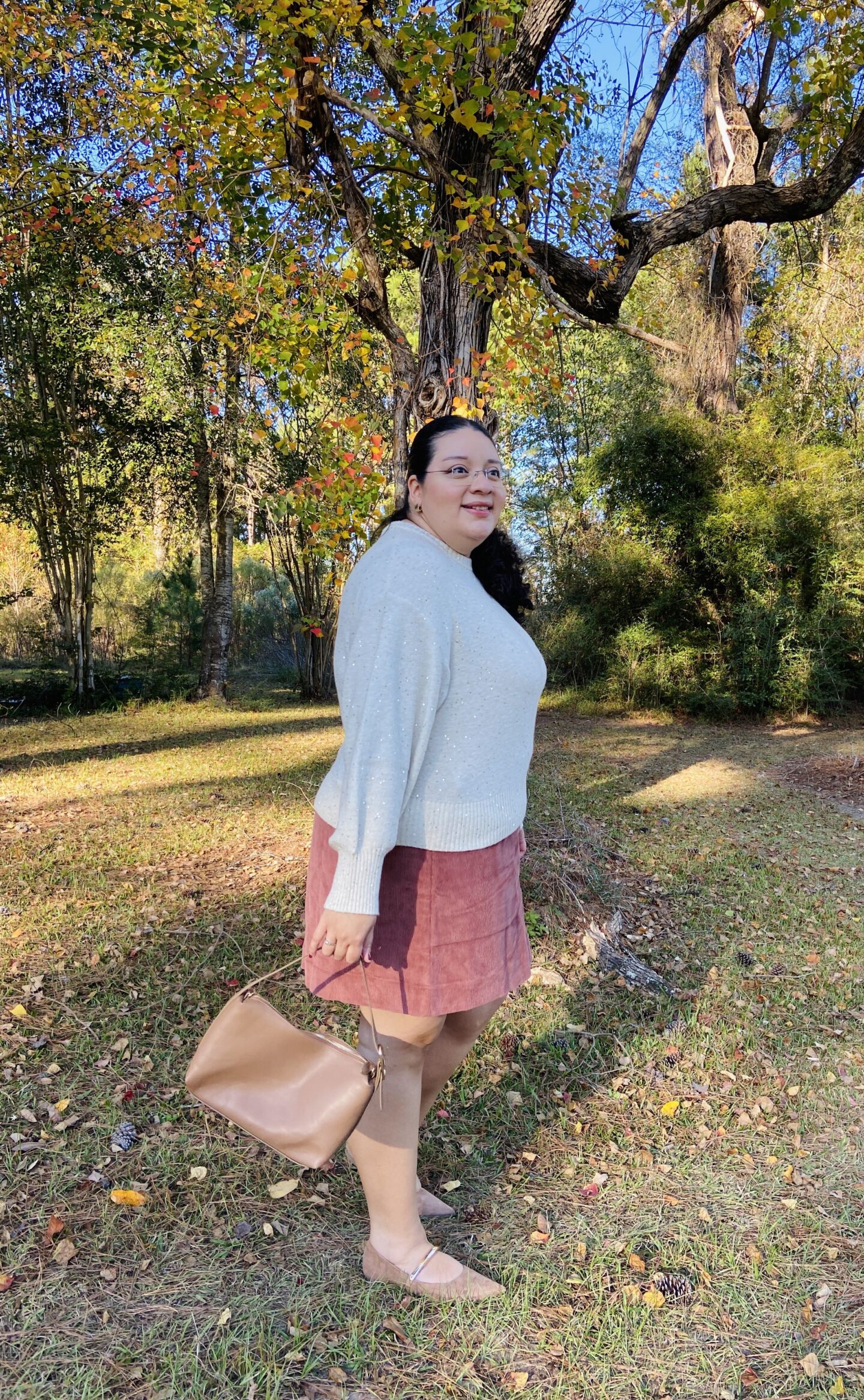 Pair a sparkle-knit sweater with a soft suede skirt for a look that balances festive glam with autumn warmth. The shimmer of the sweater catches the holiday glow, while the suede adds a rich, seasonal texture. I added this pair of flats from Target that helped to bring the outfit together.