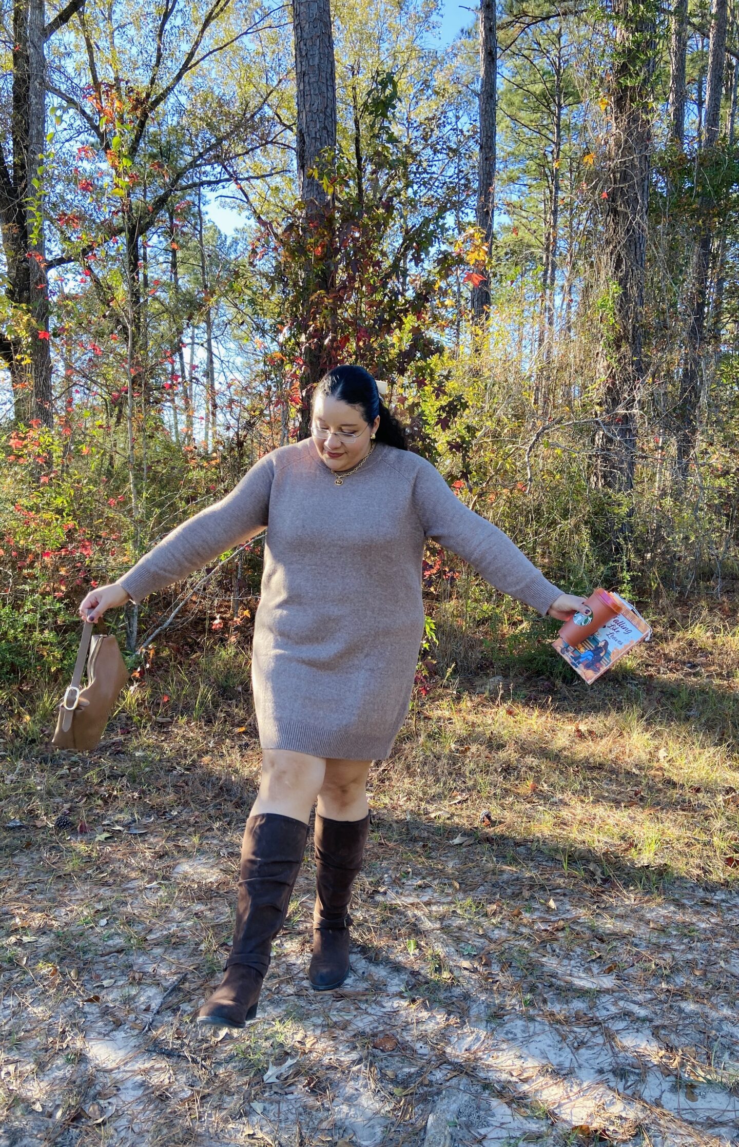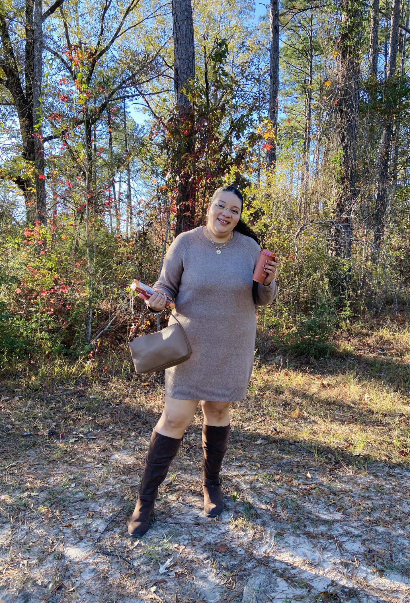Keep things cozy and chic this Thanksgiving with a classic sweater dress paired with knee-high boots. I actually got these boots from Torrid a few years ago, but I’ve linked a similar pair here. This combo is effortlessly stylish — warm enough for a family gathering, yet polished enough for photos and dinner out.