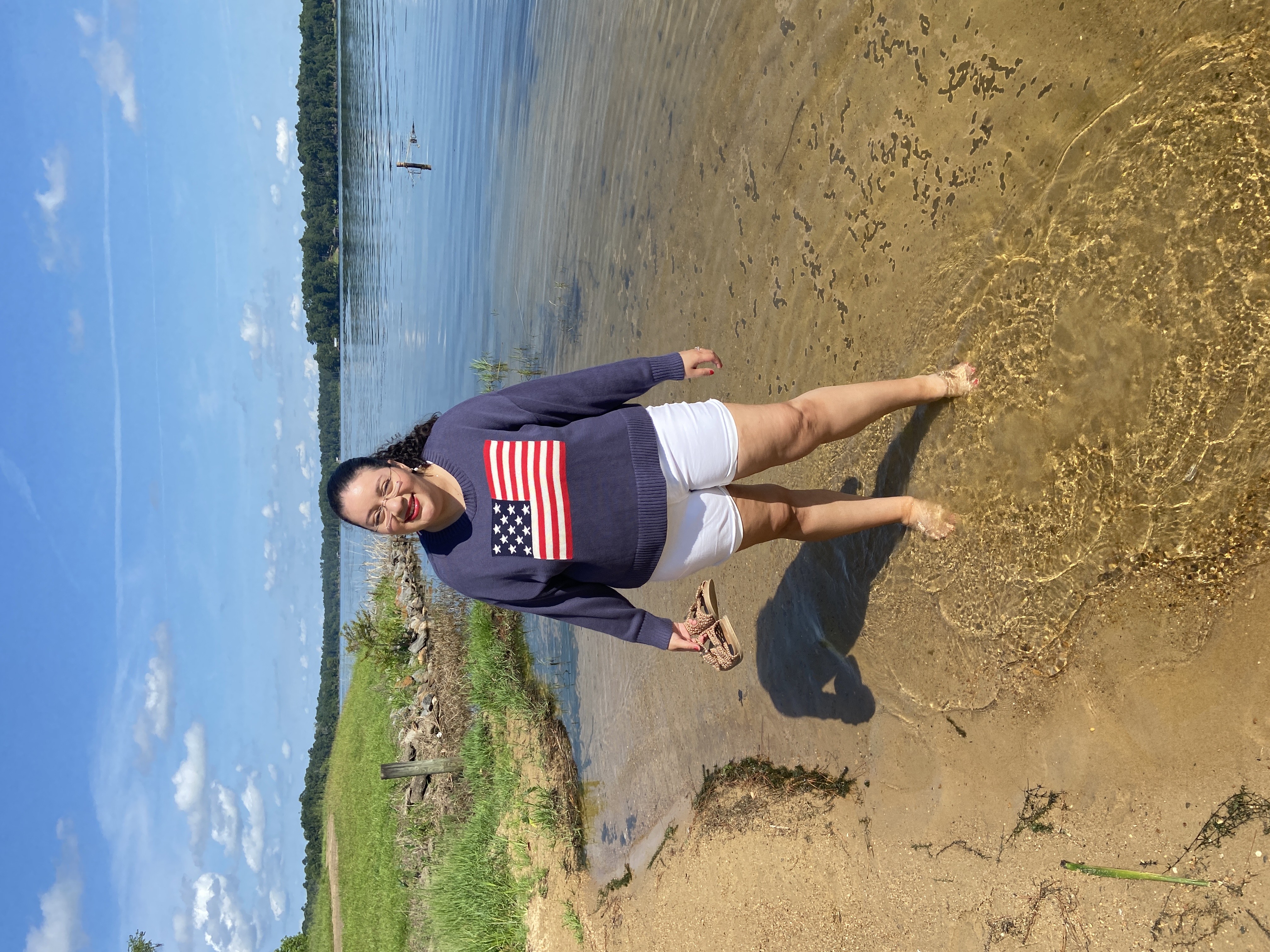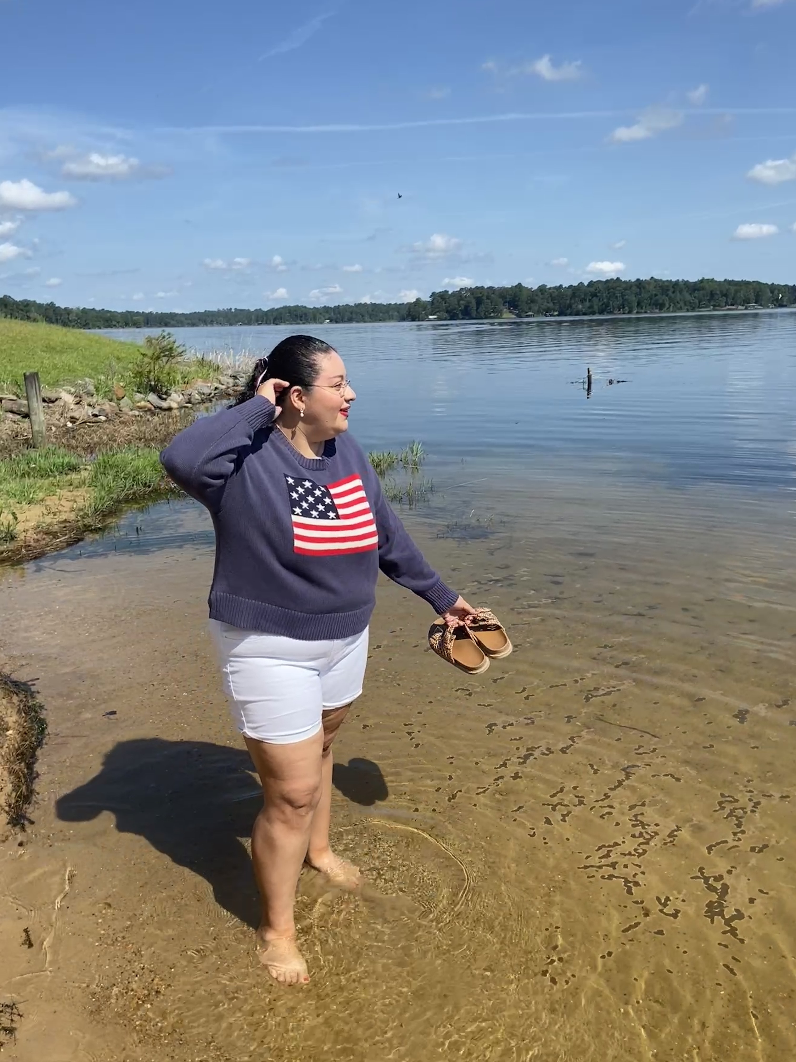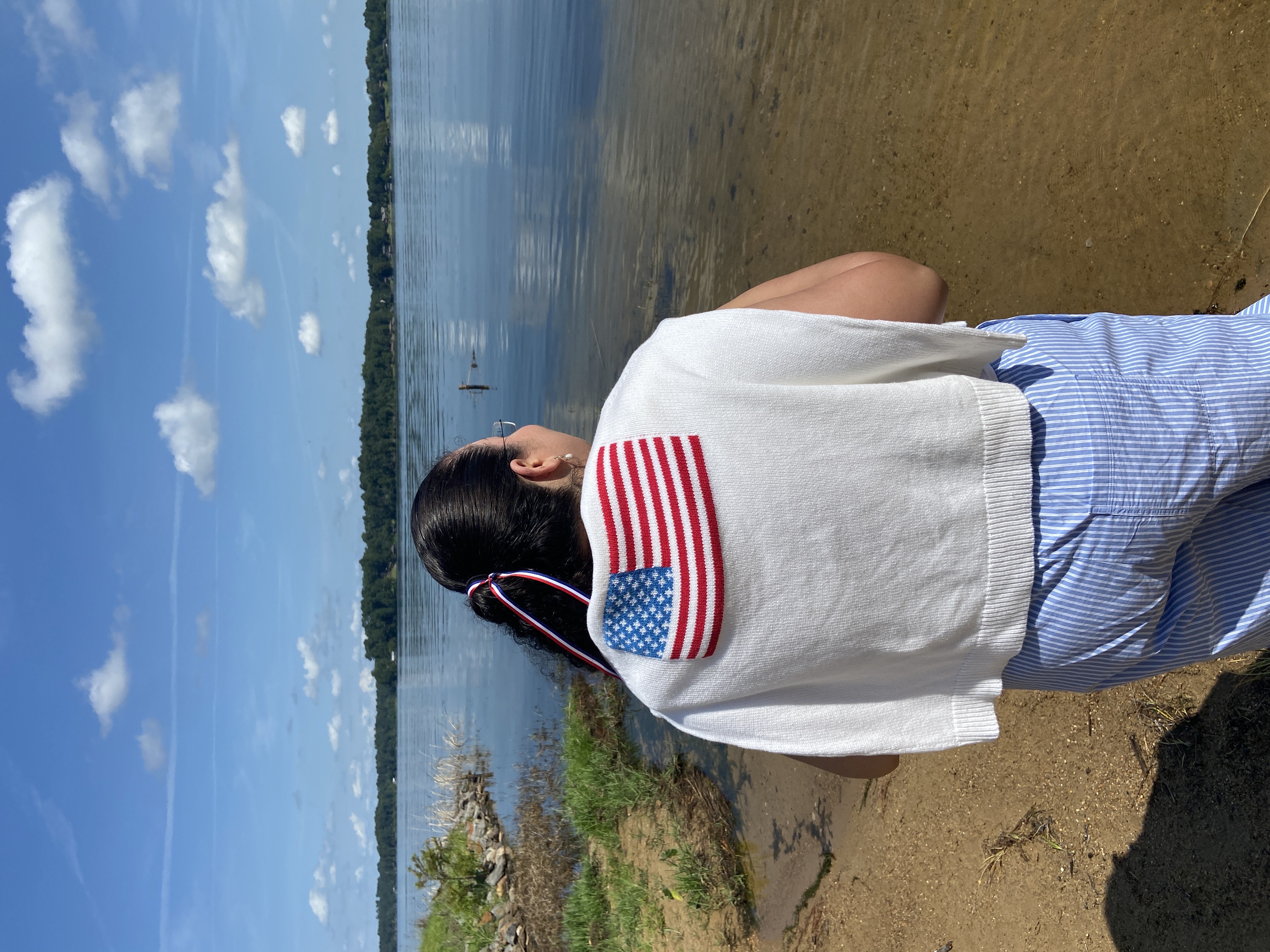 A navy American flag sweater paired with crisp white shorts is the perfect mix of patriotic and preppy. The bold flag detail makes a statement, while the white shorts keep the look fresh and summer-ready. Whether you’re watching fireworks by the water or enjoying a backyard BBQ, this outfit feels timeless and festive.