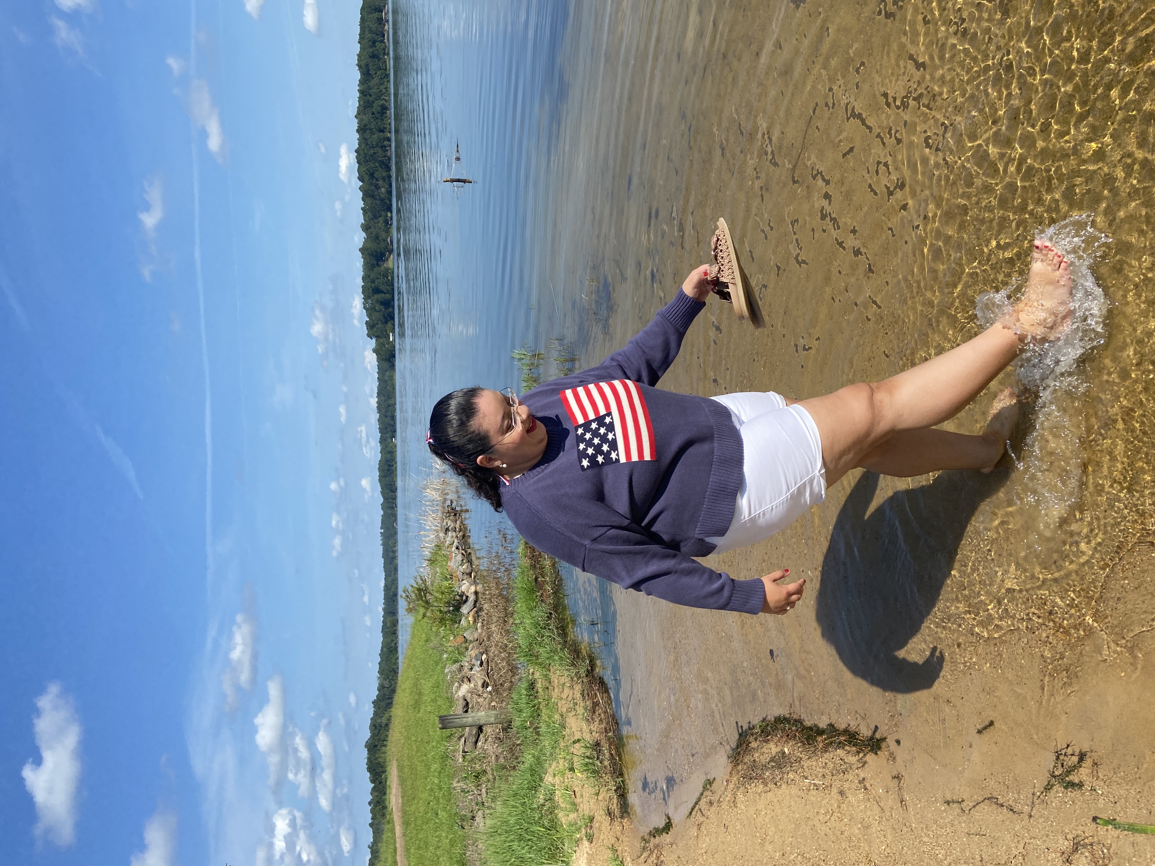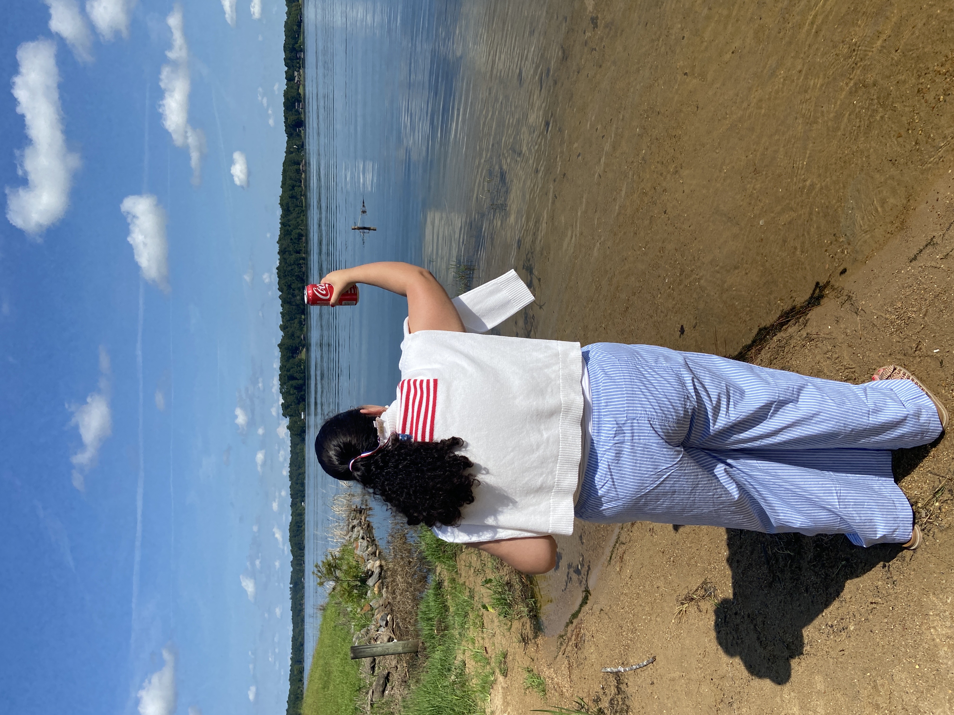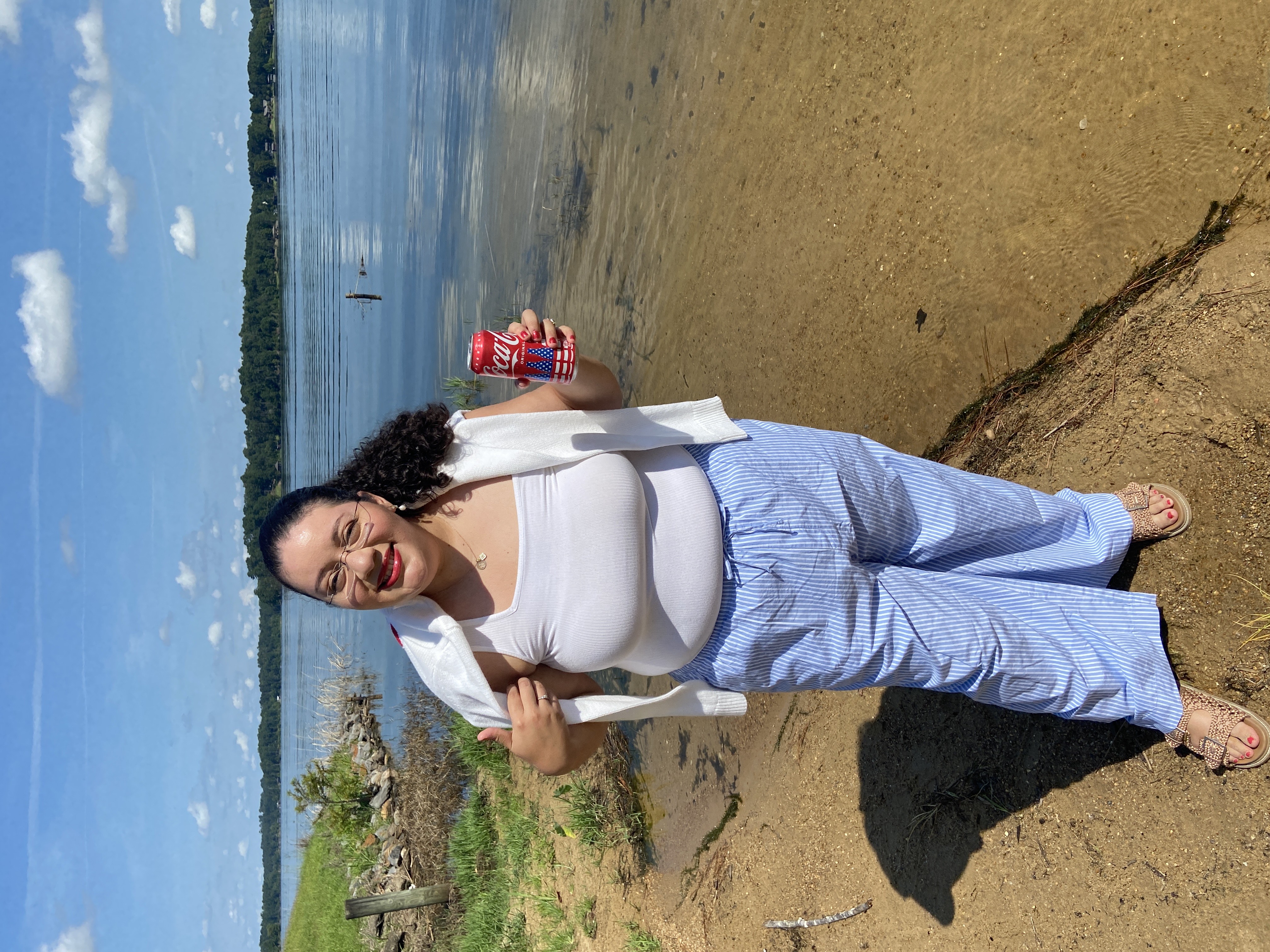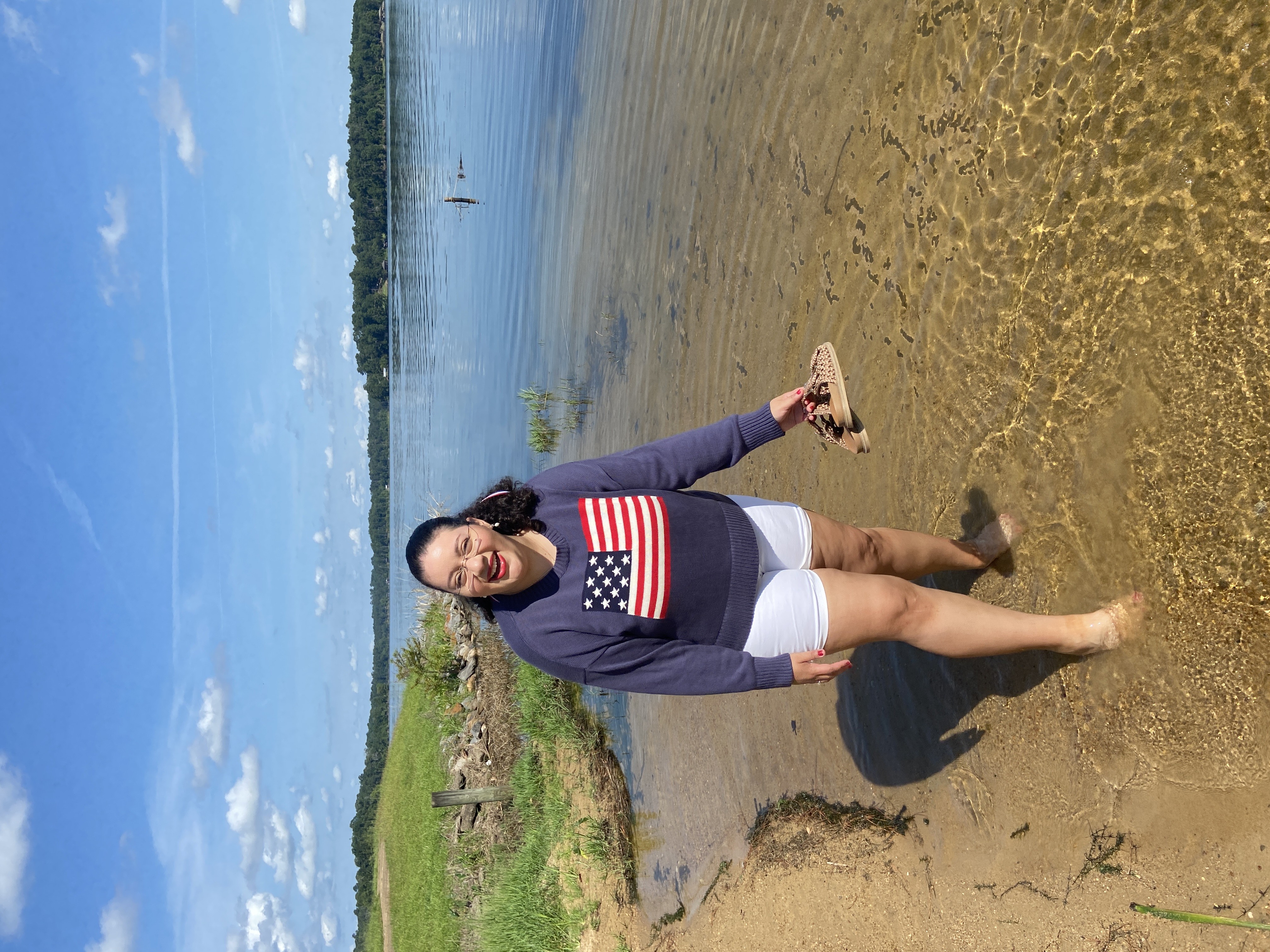 A white American flag sweater layered over a simple white tank adds a cozy, festive touch—perfect for breezy evenings or waterfront firework shows. Pair it with blue and white striped pants for a nautical nod that keeps the red, white, and blue theme going strong. Add neutral sandals or classic white sneakers, and you’ve got a look that’s both comfortable and celebration-ready.